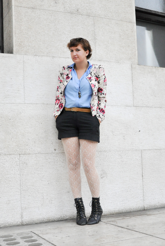 Shirt - H&M, shorts - Benetton, jacket - H&M, booties - 3Suisses, lace leggings - Calzedonia,bag - Topshop, sunnies - Ray Ban, necklace - vintage, bracelets - Accessorize and H&M, rings - vintage